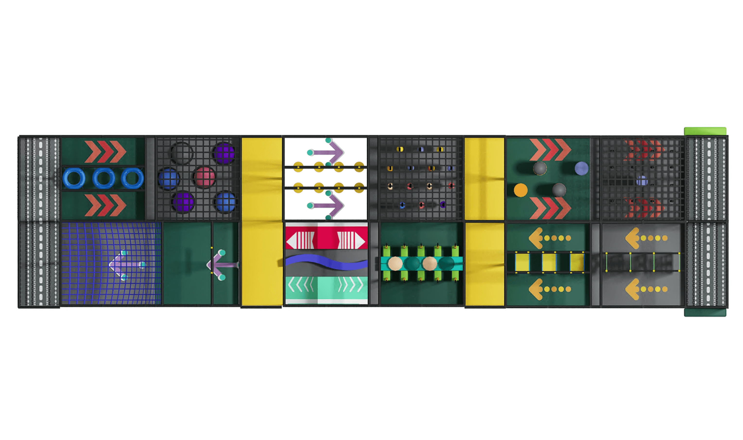 The fully enclosed steel frame structure provides a safe and durable environment for high-energy play, while padded obstacles and protective netting ensure children can explore the course safely.